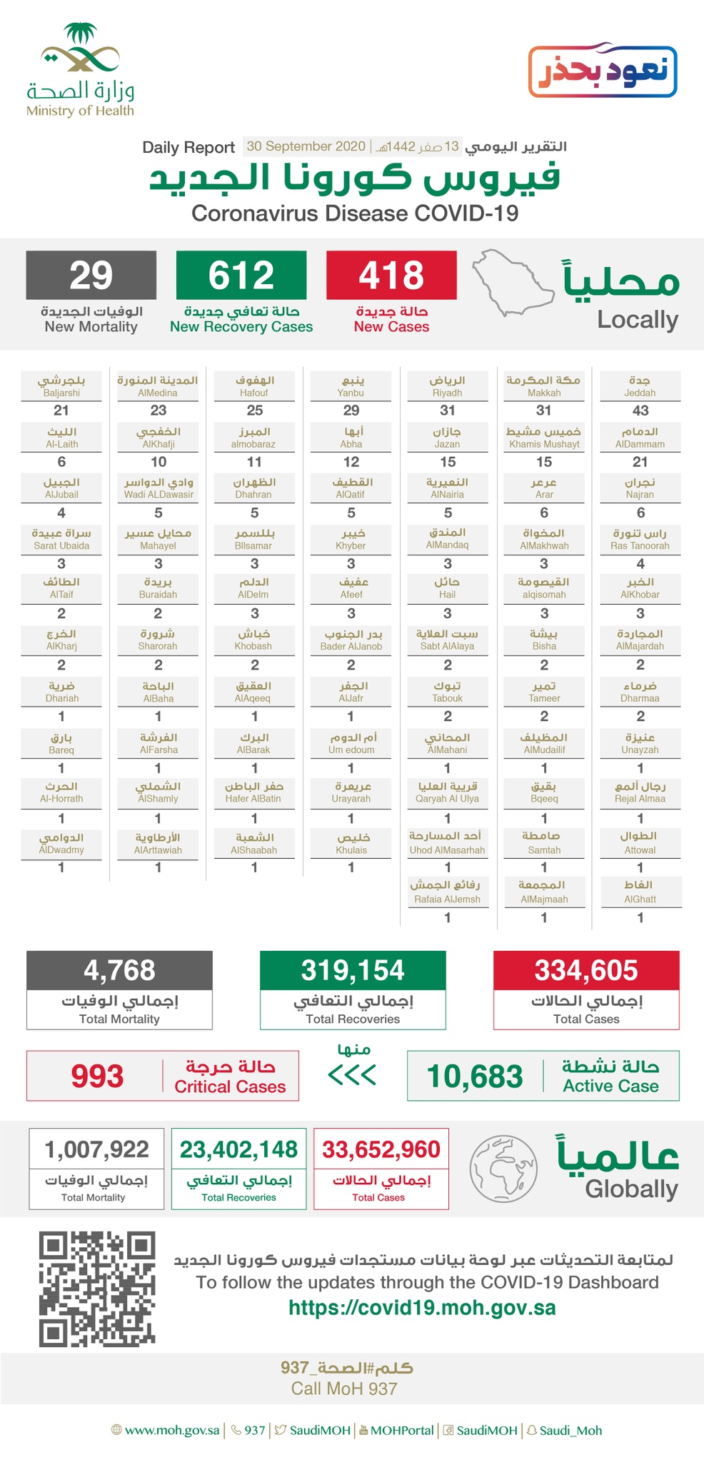 وتم تسجيل 612 حالة تعافٍ جديدة، لترتفع الحالات الإجمالية للتعافي إلى 319154 حالة، (95% من إجمالي الإصابات المسجلة).