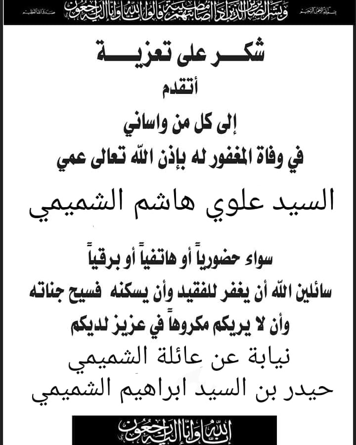 انتقل إلى رحمة الله تعالى الحاج السيد علوي السيد هاشم علوي الشميمي «أبو سيد حسين»، من أهالي القديح «حي التركية»، عن عمر ناهز 98 عاماً.