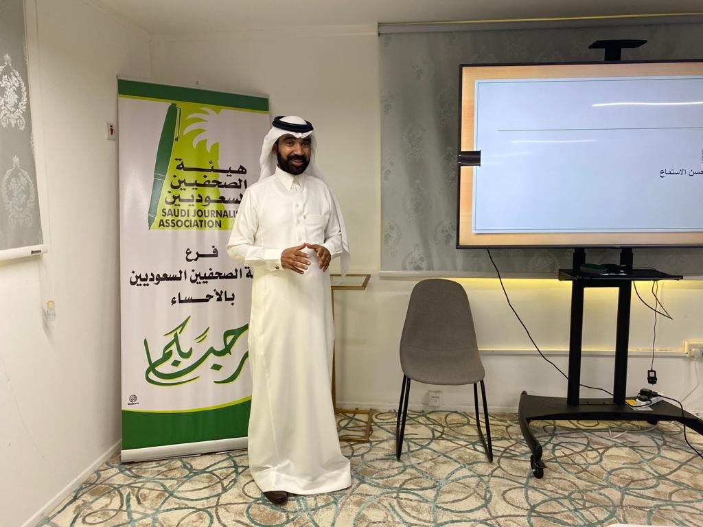 قدم الورشة التي جاءت تحت عنوان ”مهارات المراسلين الميدانيين“ عضو هيئة الصحفيين الزميل عبداللطيف المحيسن، في قاعة الجوهرة الحميان بمقر الفرع في مدينة المبرز.