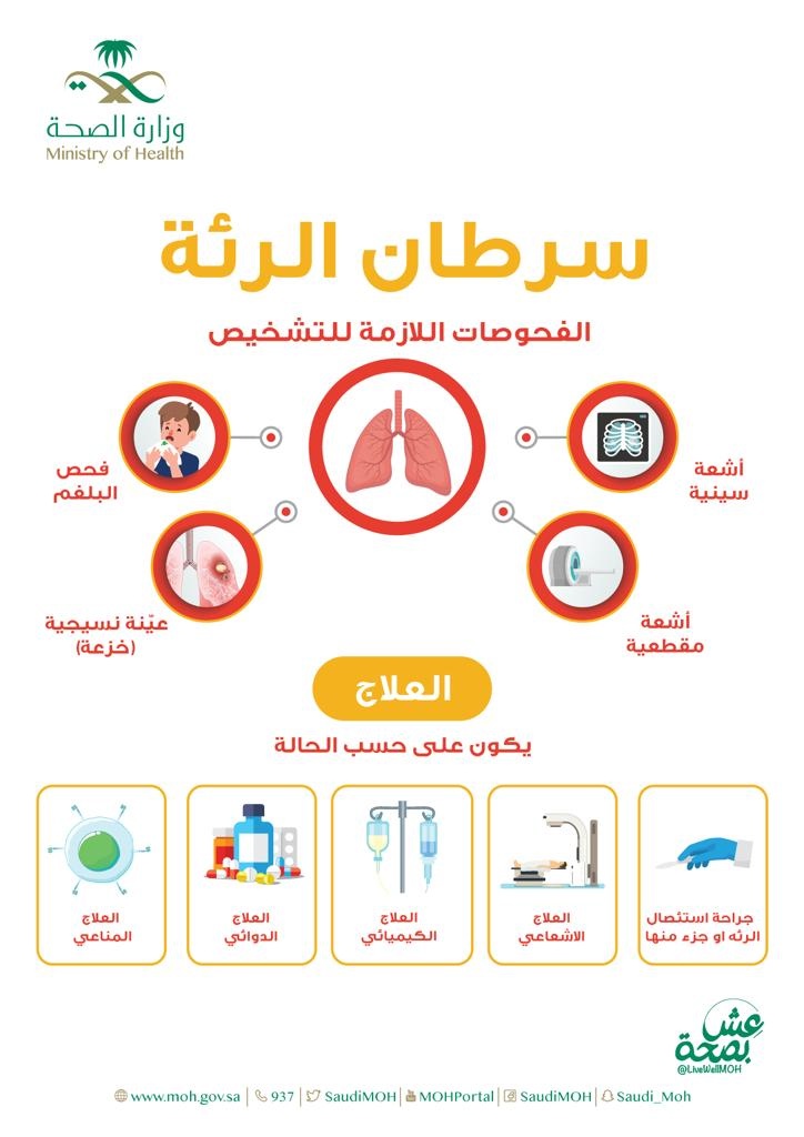 ونشرت الصحة على حسابها على منصة ”تويتر“ ومنصتها التوعوية ”عش بصحة“، إنفوجرافيك يبين الفحوصات اللازمة للتشخيص، وكيفية العلاج بحسب الحالة وعوامل الخطر مثل التدخين، أو التعرض للتدخين السلبي.