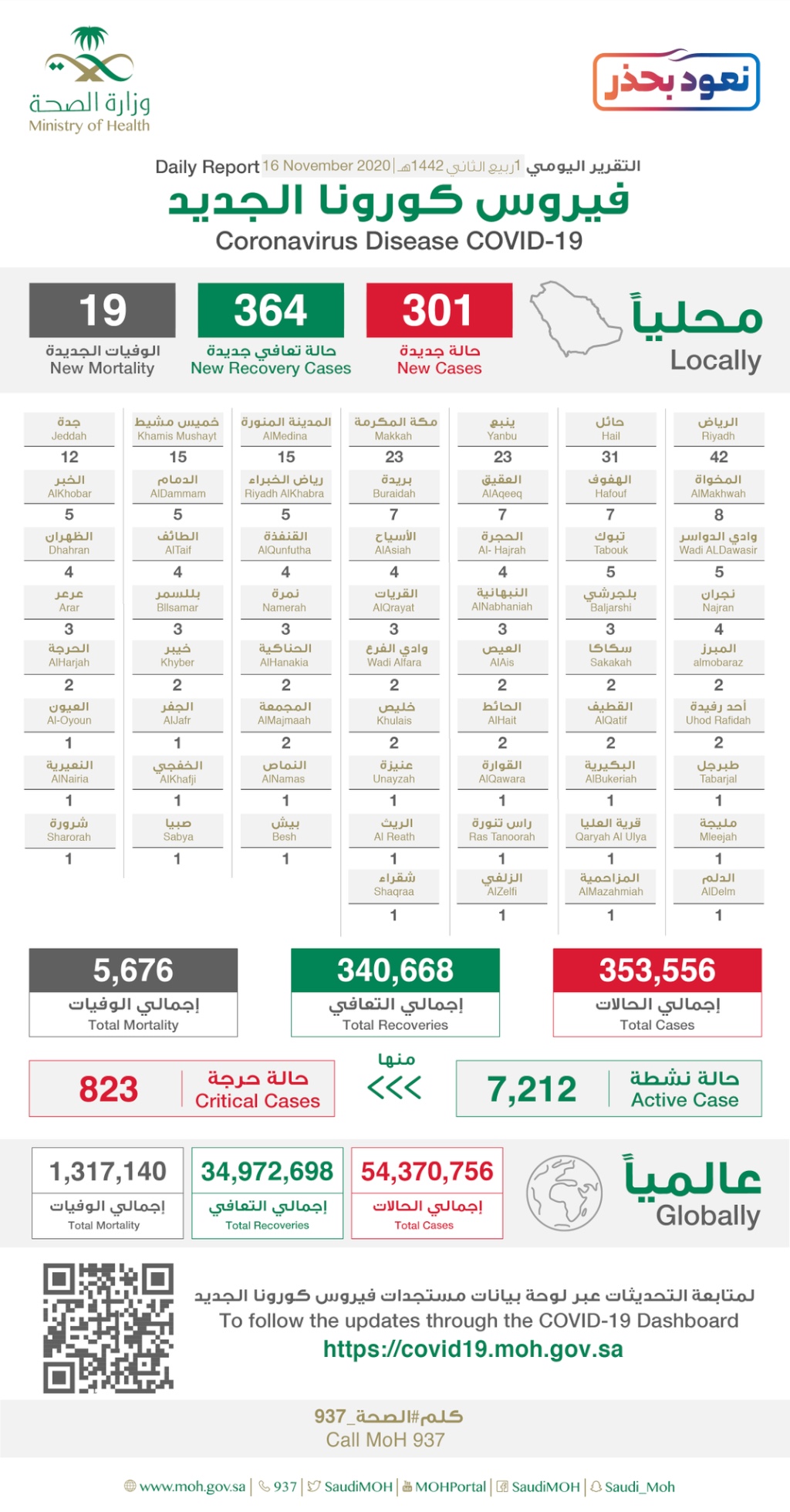 ولمعرفة تفاصيل إجمالي توزيع حالات الإصابة والتعافي، يمكن زيارة الموقع الإلكتروني المخصص من وزارة الصحة للاطلاع على مستجدات الفايروس في المملكة، والإحصاءات اليومية عبر الرابط https://covid19.moh.gov.sa/