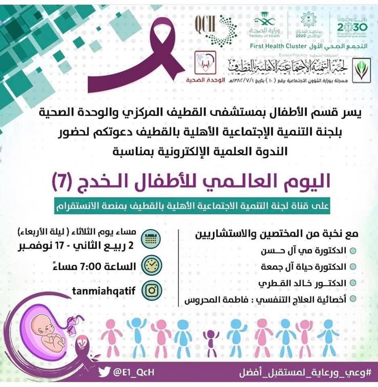 ينظم قسم الأطفال بمستشفى القطيف المركزي والوحدة الصحية بلجنة التنمية الاجتماعية الأهلية بالقطيف الندوة العلمية الإلكترونية بمناسبة اليوم العالمي للأطفال الخدج 7 وذلك على قناة لجنة التنمية الاجتماعية الأهلية بالقطيف بمنصة الانستقرام مساء يوم الثلاثاء.