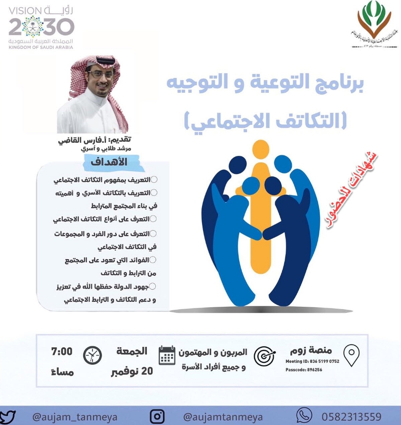 تنظم لجنة التنمية الاجتماعية الأهلية بالأوجام برنامج عبر الفضاء الالكتروني بعنوان «التكاتف الاجتماعي» يقدمها المرشد الأسري والطلابي الأستاذ فارس القاضي.