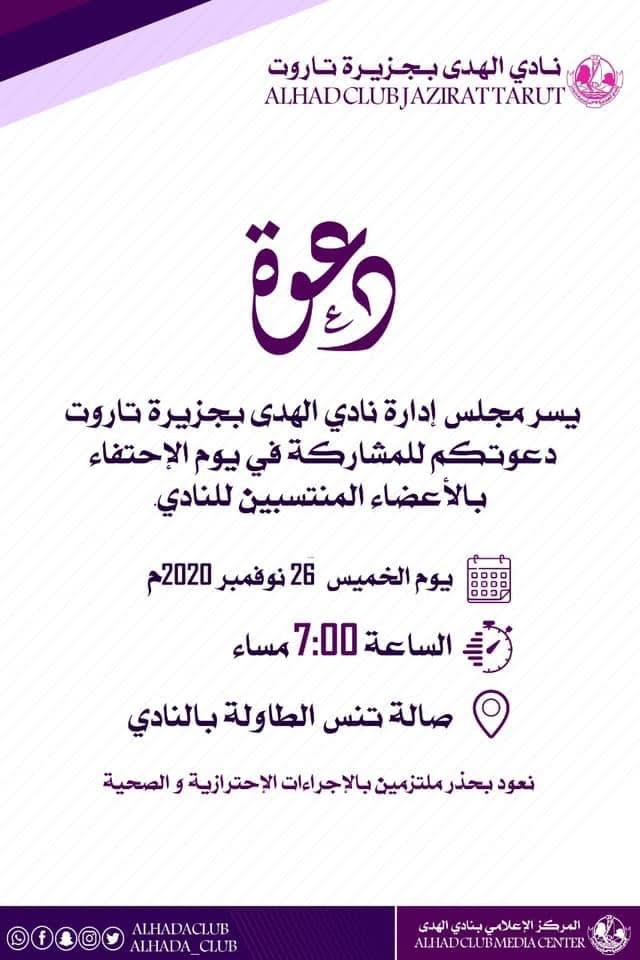 يقيم مجلس إدارة نادي الهدى بجزيرة تاروت، غدًا الخميس، حفل تكريمي يحتفي فيه بالأعضاء المنتسبين والمشتركين بعضوية النادي، وذلك بمقر النادي.