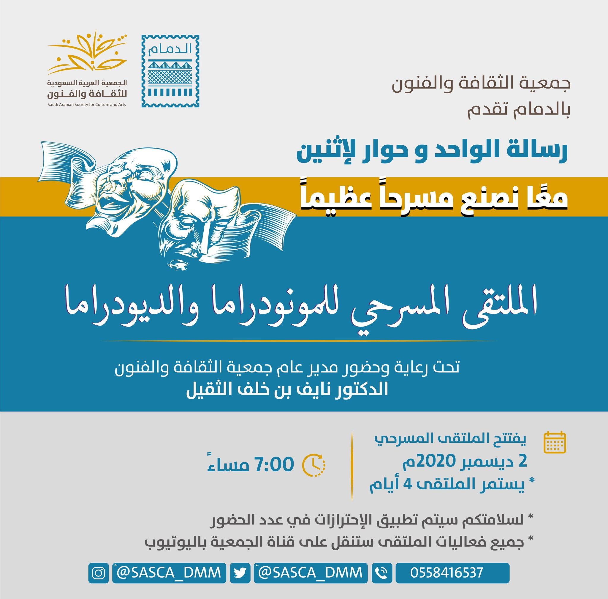تنظّم جمعية الثقافة والفنون بالدمام الملتقى المسرحي للمونودراما والديودراما، حيث سيشكّل الملتقى فضاء للتعبير والأداء والكتابة والتنشيط والإخراج والمعالجات الدرامية في المونودراما والديودراما مع الاهتمام بالفنون المسرحية وحركتها المُتطوّرة والمُواكبة لكل الانفتاح الثقافي على المبدعين والهواة والمهتمين بالمسرح السعودي.