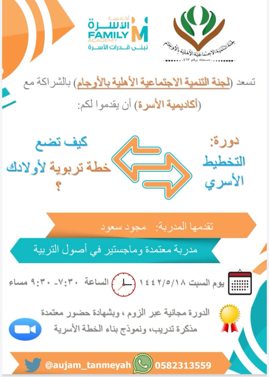 يسر لجنة التنمية الاجتماعية الأهلية بالأوجام بالشراكة مع أكاديمية الأسرة دعوتكم لحضور دورة ”التخطيط الأسرى“ و”كيف تضع خطة تربوية لأولادك“.