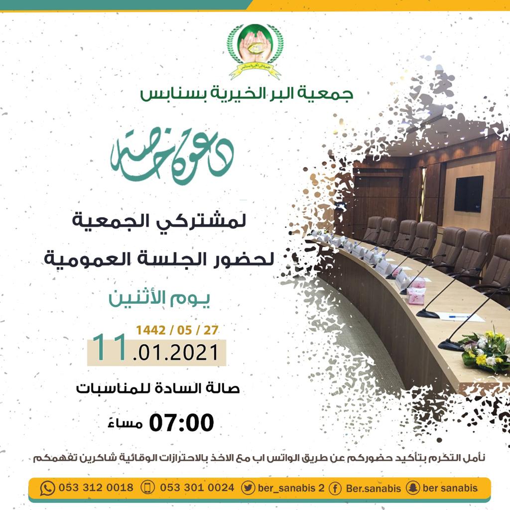 دعت جمعية البر الخيرية بسنابس مشتركي الجمعية لحضور الجلسة العمومية.