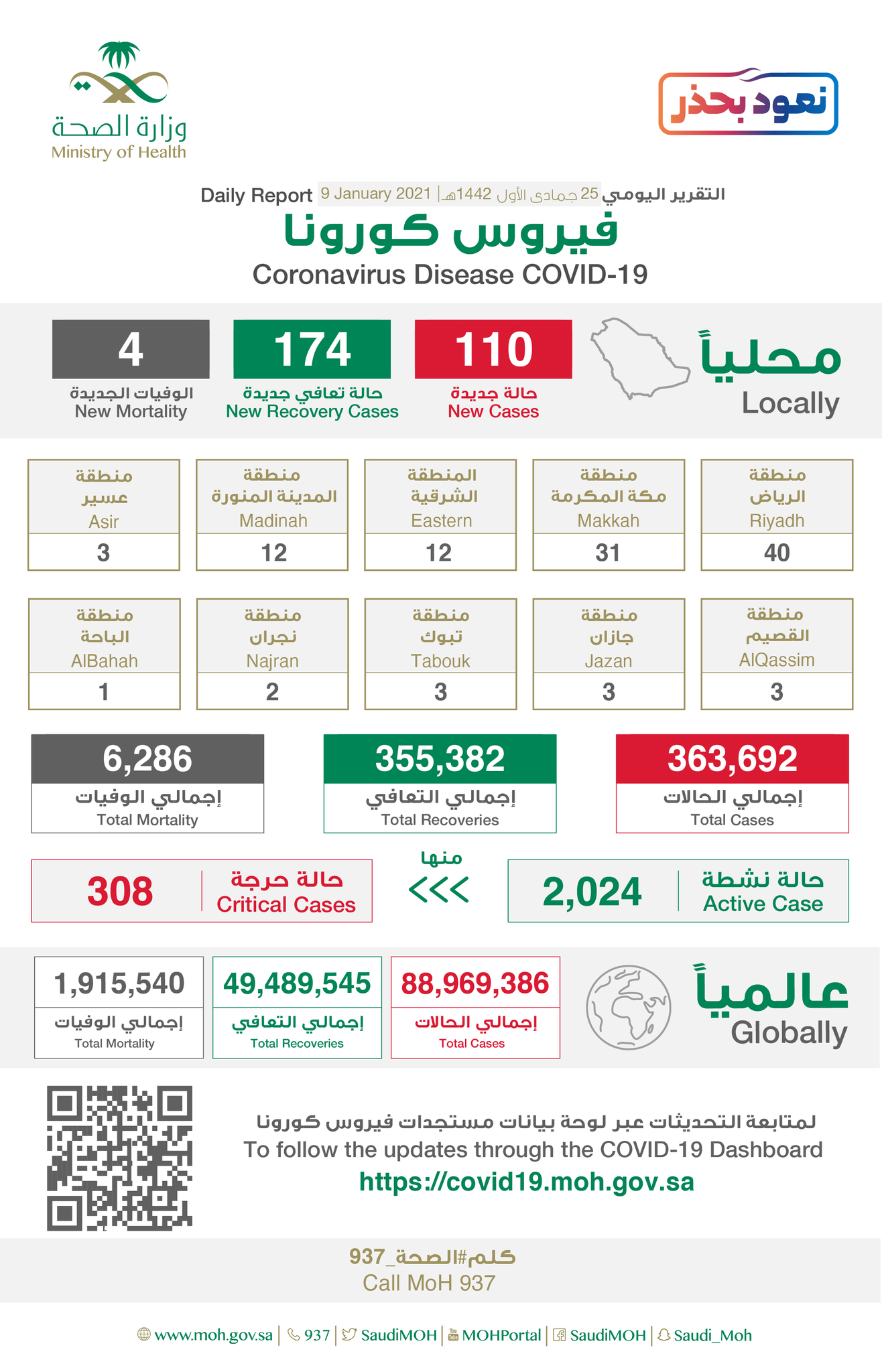 كما أعلنت الصحة عن تسجيل ”174“ حالة تماثلت للشفاء، ليصل مجموع المتعافين إلى ”355382“ حالة تعافي، فيما ارتفع إجمالي الوفيات في المملكة إلى ”6286“ حالة بعد تسجيل ”4“ حالة وفاة جديدة