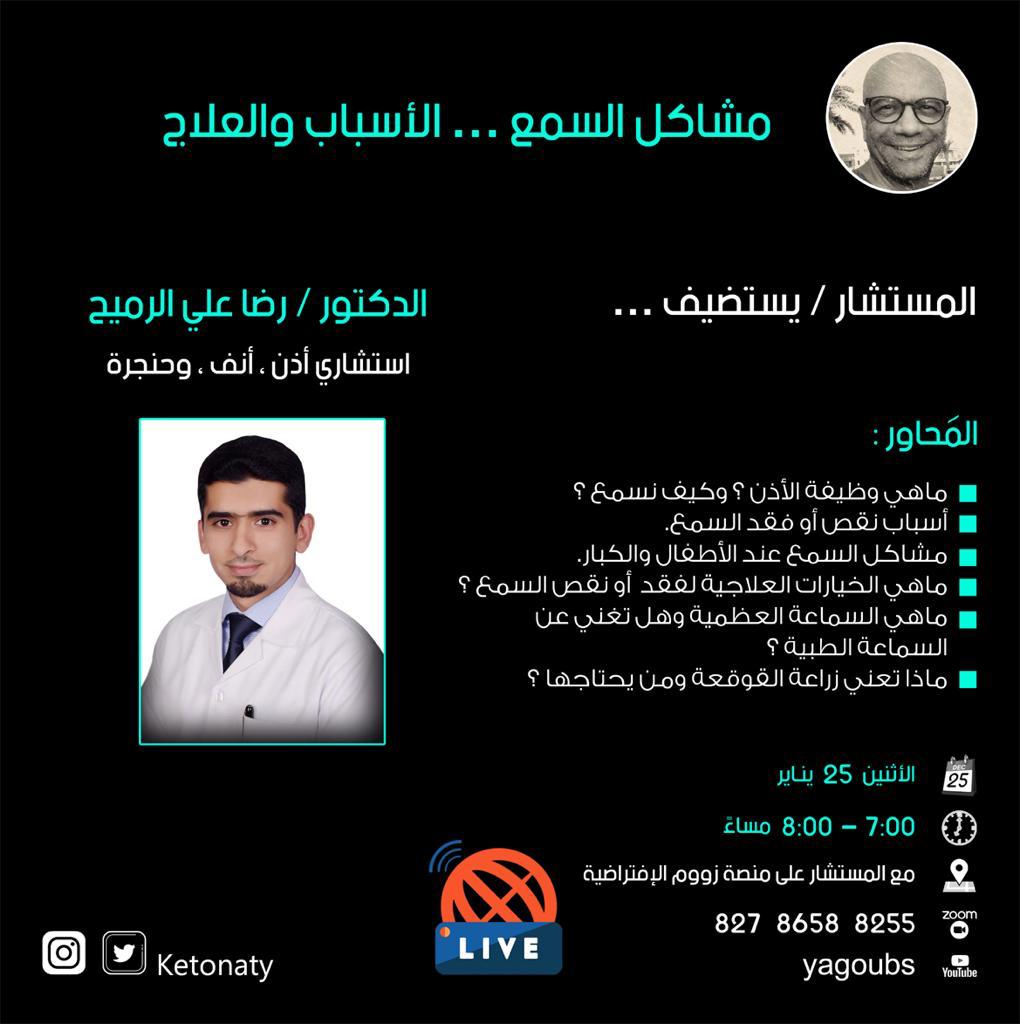 تستضيف منصة ”مع المستشار“ على برنامج (الزووم) استشاري أنف أذن وحنجرة الدكتور رضا الرميح للحديث مشاكل السمع والأسباب والعلاج عبر منصة زوم.