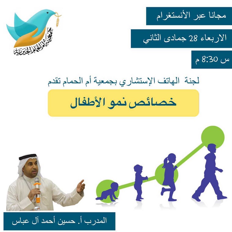 تنظم لجنة الهاتف الاستشاري بجمعية أم الحمام الخيرية أمسية «خصائص نمو الأطفال» مع المدرب حسين آل عباس يوم الأربعاء عبر الانستقرام.