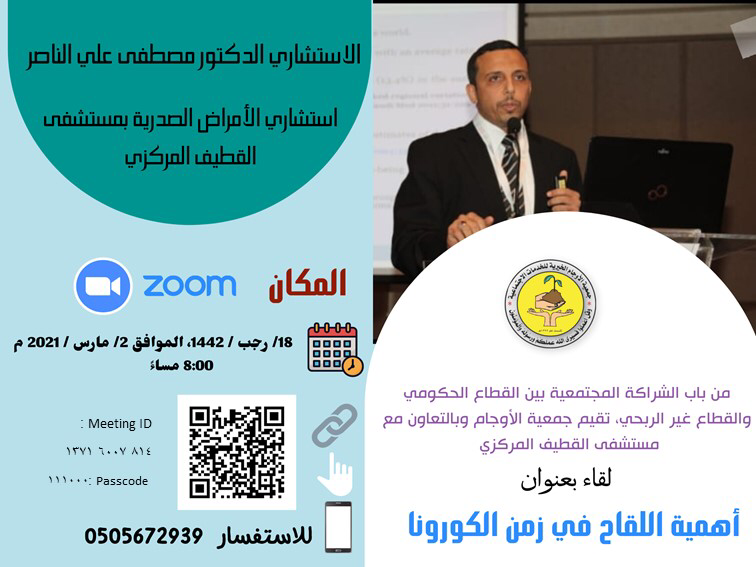 تنظم اللجنة الصحية بجمعية الأوجام الخيرية لقاء بعنوان «أهمية اللقاح في زمن الكورنا» يقدمها رئيس قسم الأمراض الصدرية بمستشفى القطيف المركزي الدكتور مصطفى علي الناصر، بالتعاون مع مستشفى القطيف المركزي.