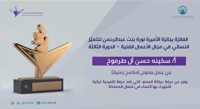 فازت التشكيلية سكينه حسن آل طرموخ بجائزة الأميرة نورة للتميّز النسائي في دورتها الثالثة وذلك عن مجال الأعمال الفنية.
