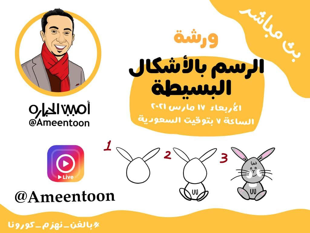 يقدم فنان الكاريكاتير أمين الحباره ورشة الرسم بالأشكال البسيطة