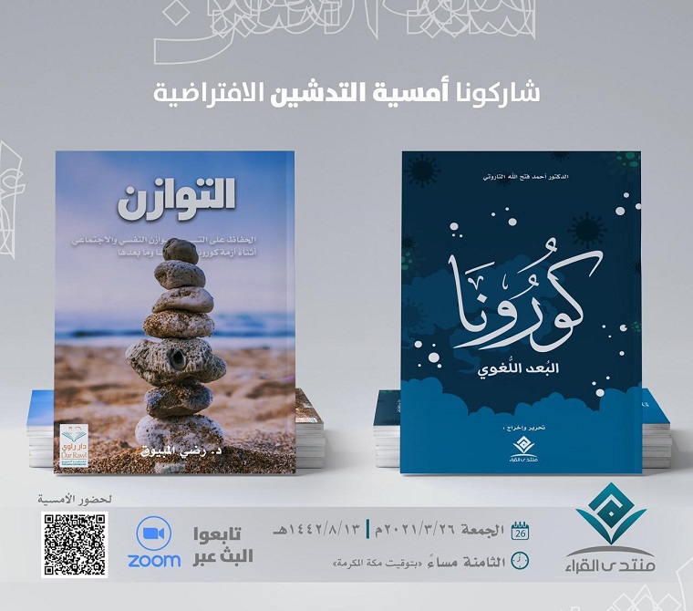 يدعو منتدى القراء للمشاركة في الأمسية الافتراضية لتدشين كتاب «كورونا..البعد اللغوي» للدكتور أحمد فتح الله التاروتي وكتاب «التوازن.. الحفاظ على التوازن النفسي والاجتماعي أثناء أزمة كورونا وما بعدها» للدكتور رضي حسن المبيوق وذلك عبر برنامج الزوم.
