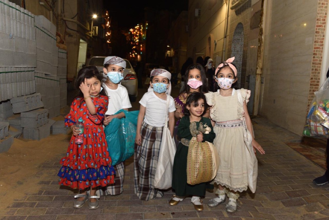 وانتشر الأطفال المتزينين بالثياب الخاصة بالقرقيعان وهم يحملون الأكياس مارين بمنازل الأقارب والجيران لجمع الهدايا والحلويات وهم يرددون بصوت مسموع ”ناصفة حلاوة اعطونا الله يعطيكم“.