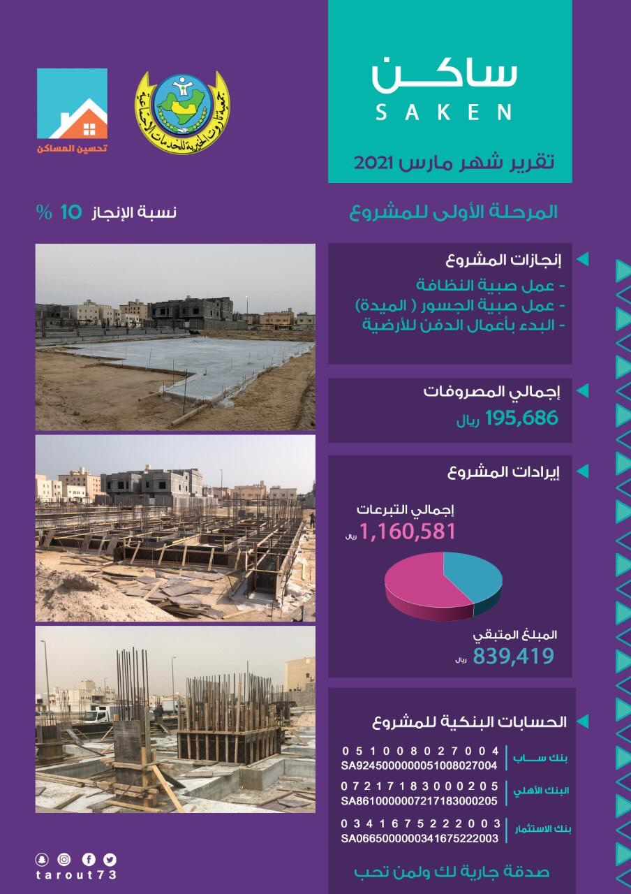 قال رئيس لجنة تحسين المساكن بجمعية تاروت الخيرية المهندس عبد الغفور الدبيسي:“ان مصروفات المرحلة الاولى من مشروع“ساكن“ خلال شهر مارس الماضي بلغت نحو: «195,686» ريالاً”.