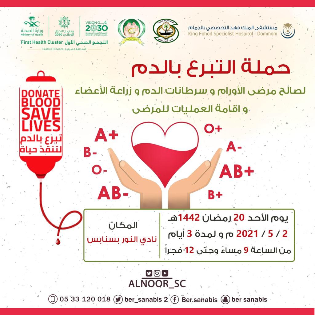 تنظِّم جمعية البر الخيرية بالشراكة مع نادي النور ببلدة سنابس ”حملةً للتبرع بالدم لصالح مرضى الأورام وسرطانات الدم وزراعة الأعضاء، وإقامة العمليات للمرضى“ بالتعاون مع مستشفى الملك فهد التخصصي بالدمام"، وتستمر الحملة لمدة ثلاثة أيام.