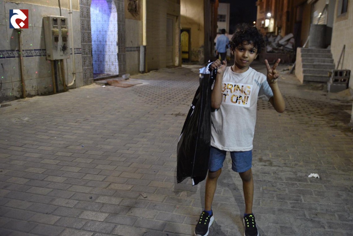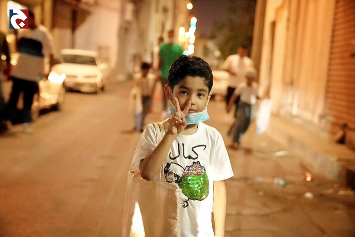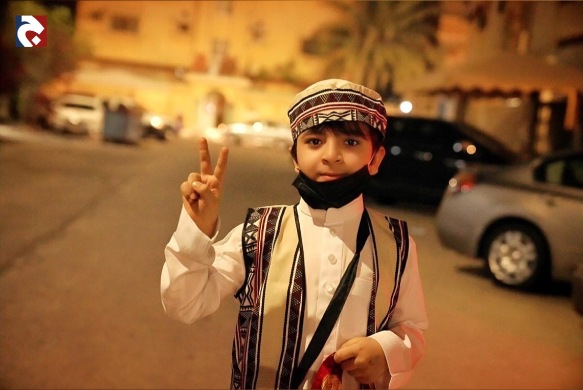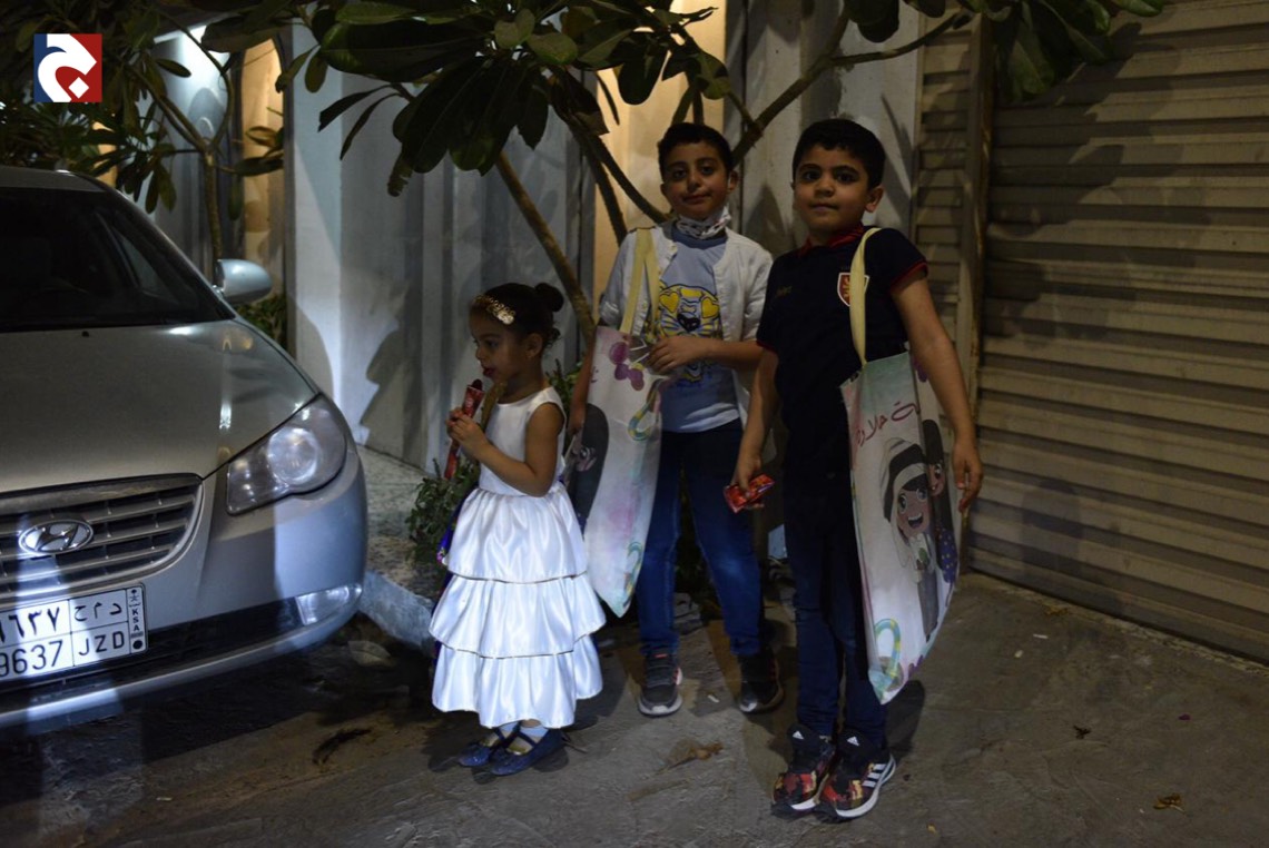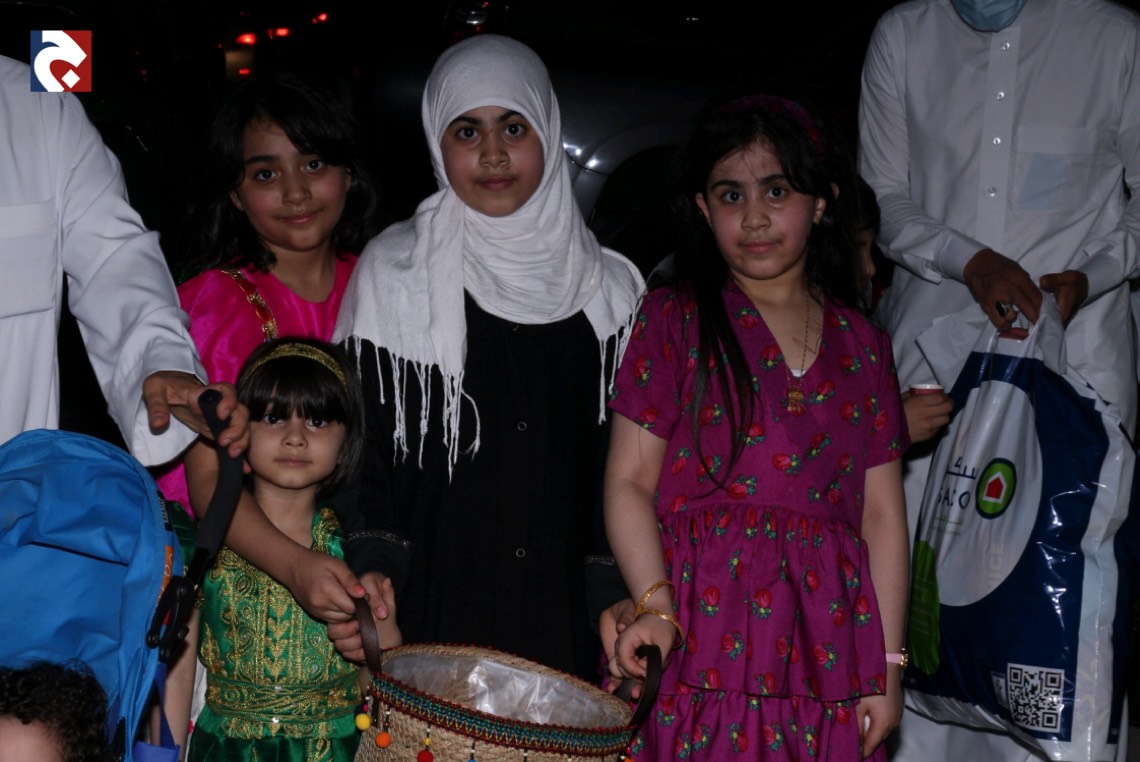 وانتشر الأطفال المتزينين بالثياب الخاصة بالقرقيعان وهم يحملون الأكياس مارين بمنازل الأقارب والجيران لجمع الهدايا والحلويات وهم يرددون بصوت مسموع ”ناصفة حلاوة اعطونا الله يعطيكم“.