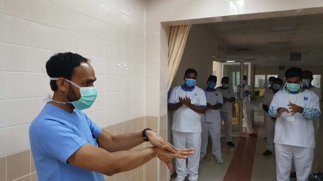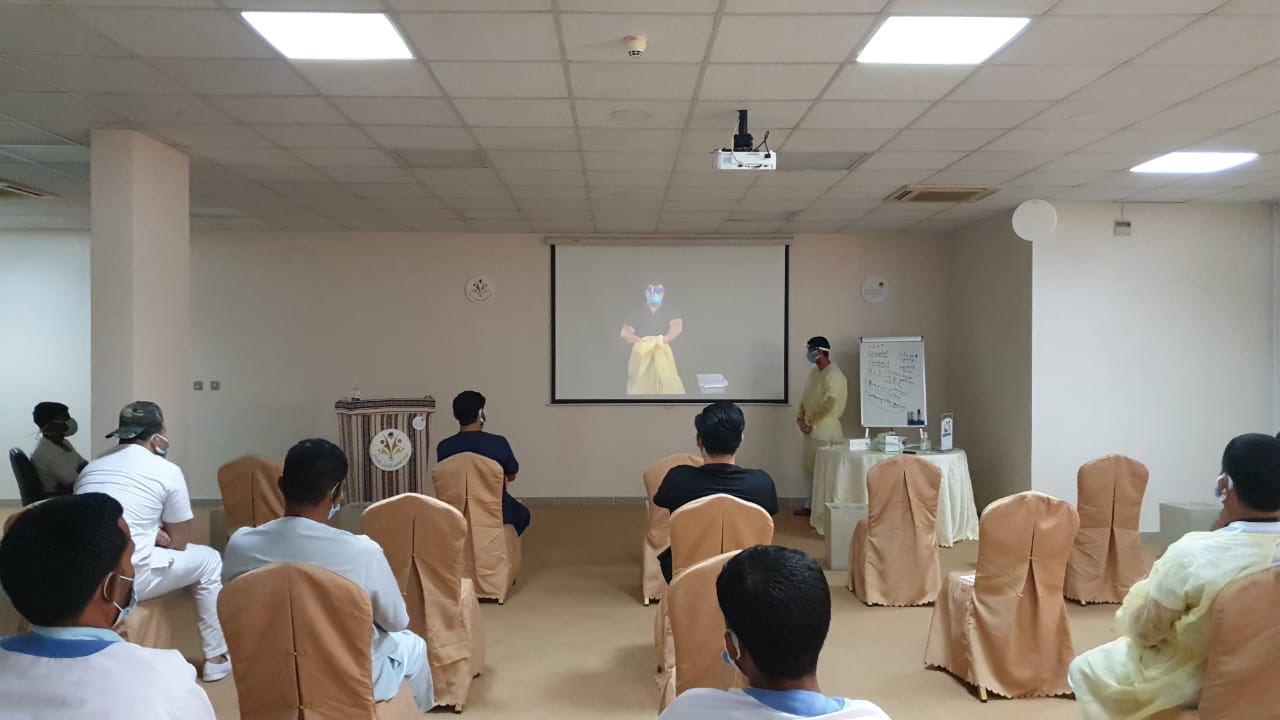 وألقى رئيس قسم الخدمات الطبية بالمركز الدكتور حسين الشويخات، محاضرة قدم فيها شرحًا وافيًا للطرق الصحيحة لعمليات غسيل الايدي وتعقيمها وكذلك ارتداء الكمام وواقي الوجة والجسم والطرق السليمة للتخلص منها، مع عرض فيديوهات توضيحية مع مشاركة احد الفنيين للشرح باللغة الأوردية لضمان وصول المعلومة.