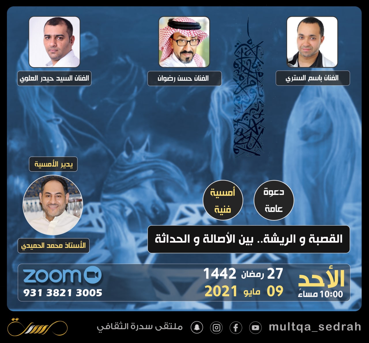 يقيم ملتقى سدرة الثقافي مساء اليوم الأحد أمسية فنية بعنوان ”القصبة والريشة.. بين الأصالة والحداثة“ وذلك عبر منصة زووم.