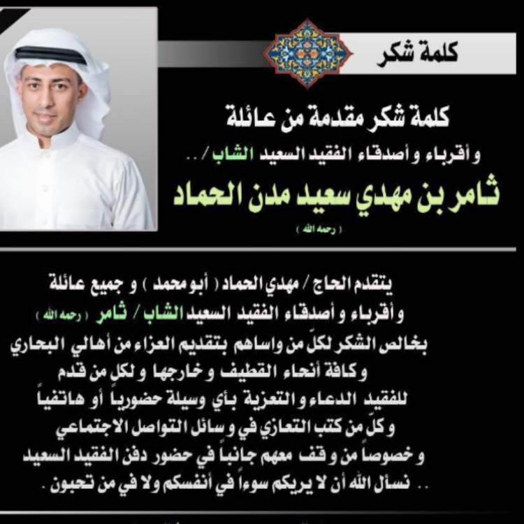 الفقيد السعيد الشاب ثامر، موظف باحدى شركات القطاع الخاص، ابن الناشط الإجتماعي مهدي الحماد، وابن عم الدكتور أحمد الحماد، وابن خالة الدكتور السيد زيدان الزيداني. تعرض الفقيد لحادث مؤسف بمنزله واختاره الله الى جواره.