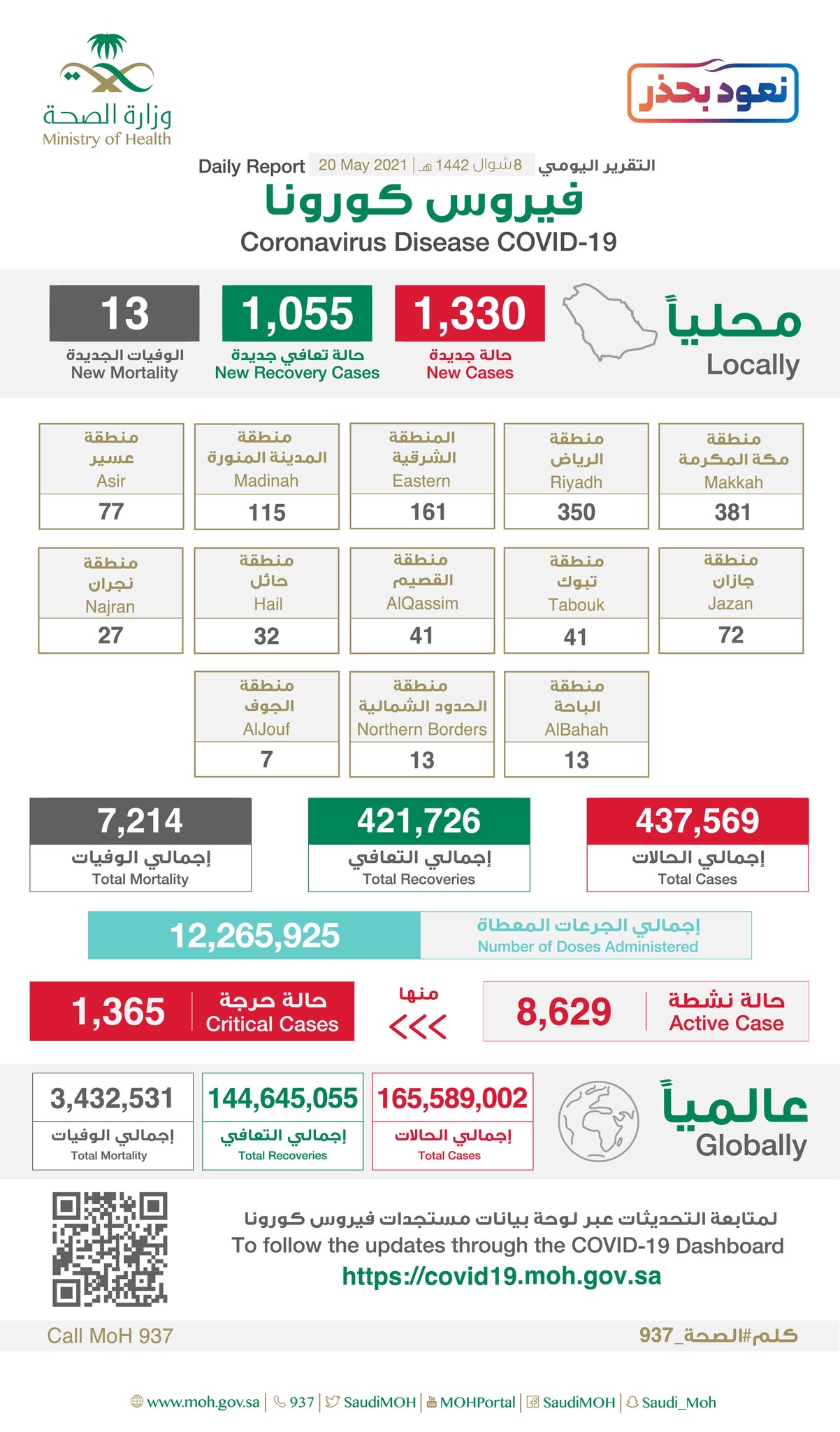 وبينت الإحصائية أن إجمالي عدد الإصابات في المملكة بلغ 437569 حالة.