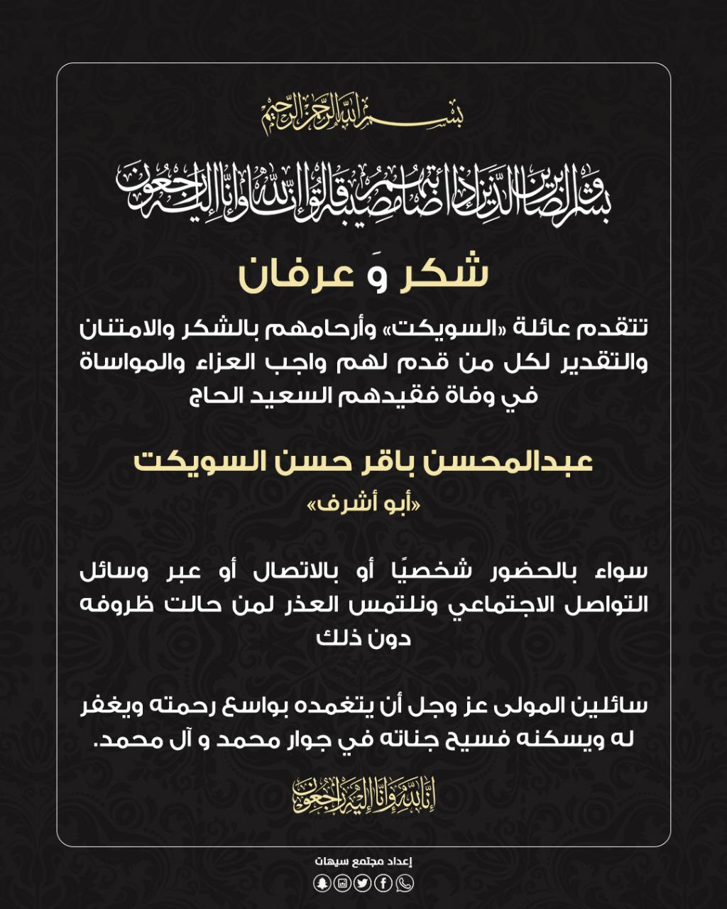 انتقل إلى رحمة الله تعالى الحاج عبد المحسن باقر حسن السويكت «أبو أشرف»، من أهالي القطيف «حي الخامسة».