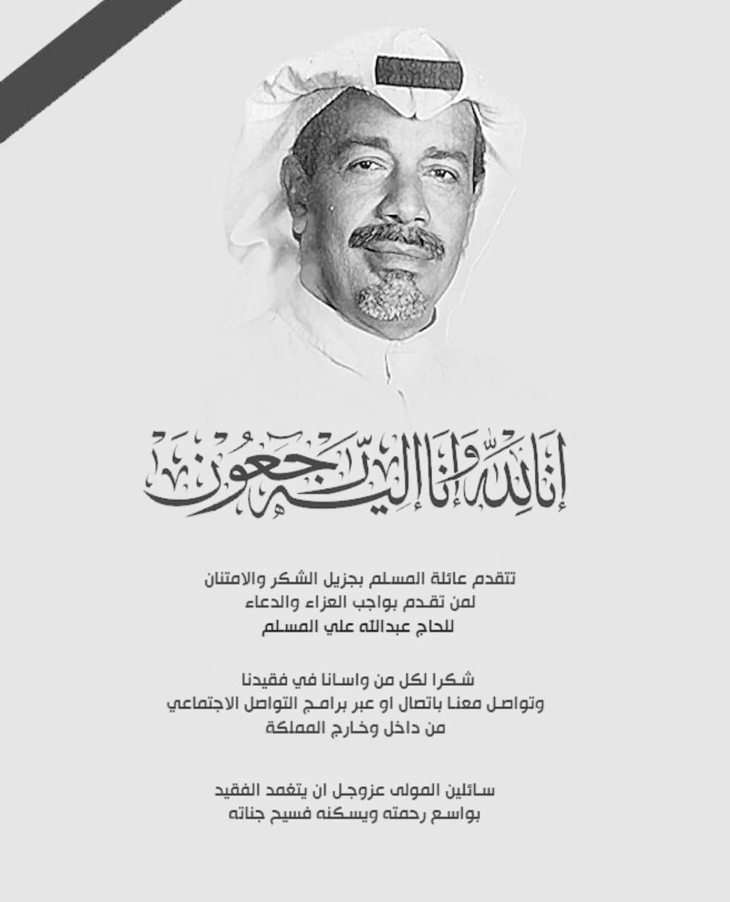 الفقيد السعيد الحاج أبو فؤاد، صائغ ذهب ومجوهرات، والد المصرفي علي المسلم مدير بنك ساب بالدمام، والمهندس أحمد المسلم الاداري بإدارة التعليم بالمنطقة الشرقية. واجه الفقيد أبو فؤاد متاعب تنفسية في الآونة الأخيرة ودخل المستشفى لتلقي العلاج منذ 11 يوما إلى أن اختاره الله الى جواره.