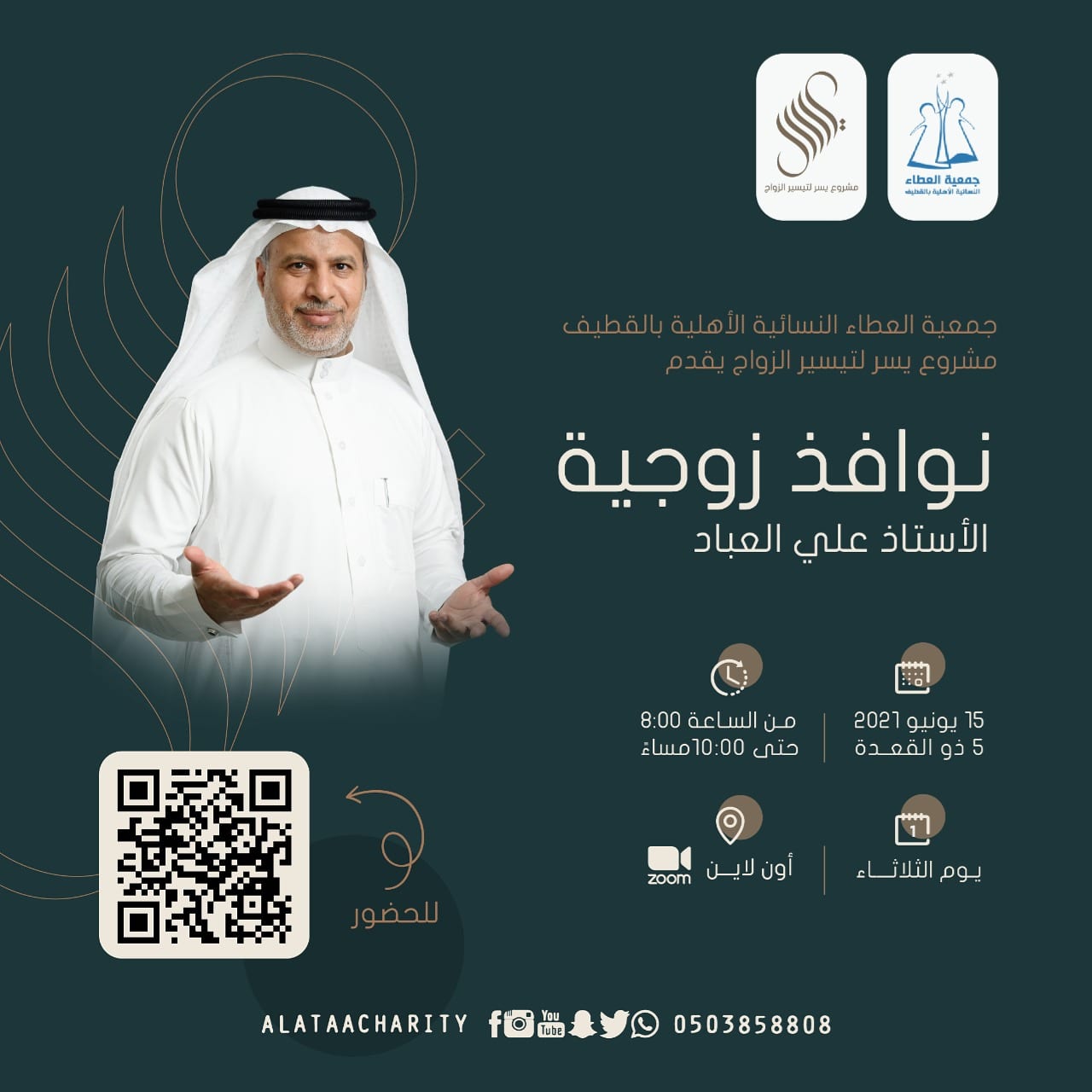 تنظم جمعية العطاء النسائية الأهلية بالقطيف اللقاء الافتراضي الخاص بمشروع ”يسر لتيسير الزواج“ بعنوان: ”نوافذ زوجية“ والذي يقدمه المدرب علي العباد.