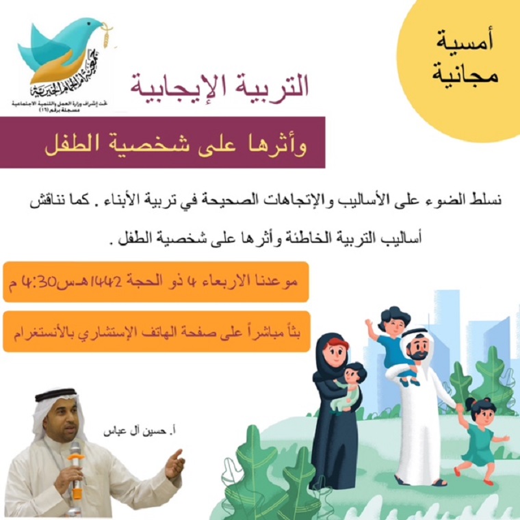 تنظم خدمة الهاتف الإستشاري بجمعية أم الحمام الخيرية أمسية «التربية الإيجابية وأثرها على شخصية الطفل» يوم الأثنين مع المدرب حسين آل عباس وذلك عبر بث مباشر على الانستقرام.