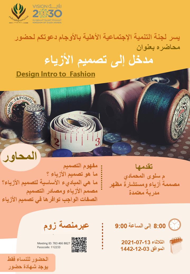 تنظم لجنة التنمية الاجتماعية الأهلية بالأوجام محاضرة بعنوان: «مدخل الى تصميم الأزياء» والتي تقدمها سلوى المحمادي يوم الثلاثاء عبر برنامج زووم.