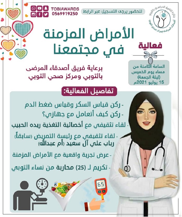 ينظم فريق أصدقاء المرضى بالتوبي ومركز صحي التوبي فعالية «الأمراض المزمنة في مجتمعنا» يوم الخميس وذلك بحضور جزء من الكادر الصحي التابع لمركز صحي التوبي