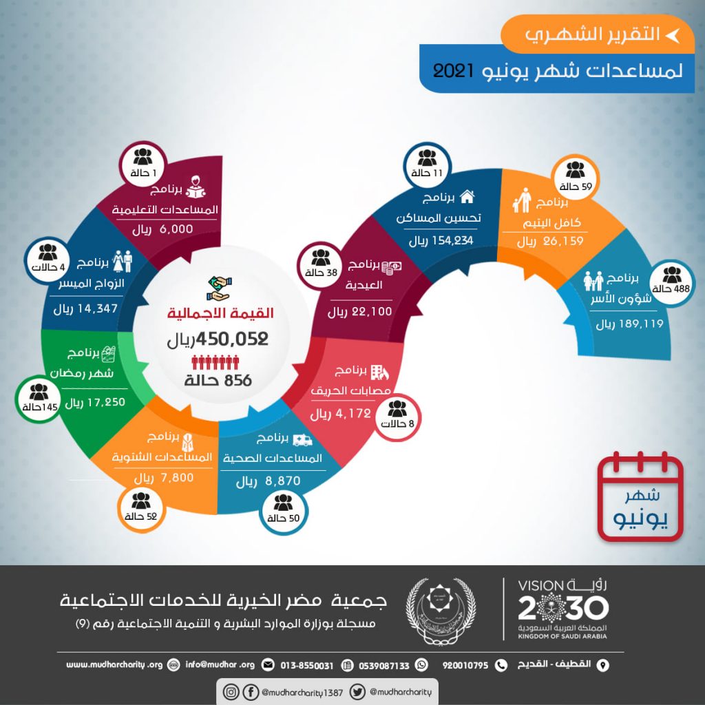 أصدرت الإدارة المالية لجمعية مضر الخيرية بالقديح تقريرها المالي لشهر يونيو 2021، حيث بلغ اجمالي مصروفات البرامج الخدمية والتنموية 450,052 ريالًا استفاد منها 856 حالة، وبزيادة بلغت 59,873 ريالًا عن شهر مايو 2021 والتي كان اجمالي مصروفاته 390,179 ريالًا.