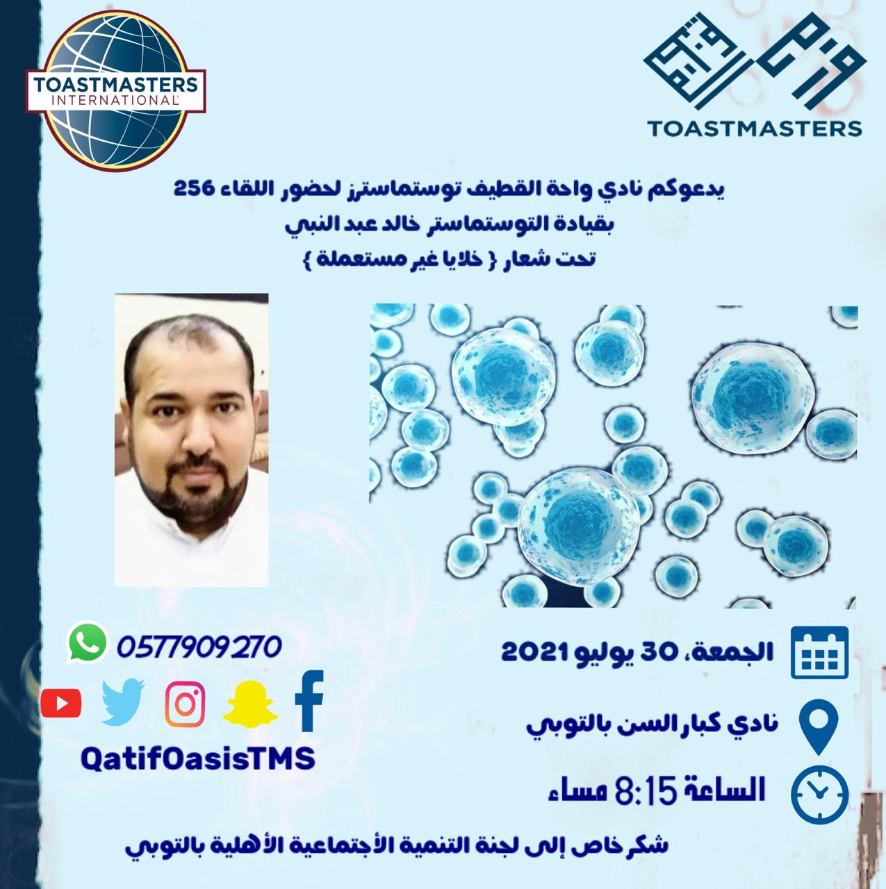 تحت شعار ”خلايا غير مستعملة“ يقيم نادي واحة القطيف توستماسترز لقائه رقم 256 مساء الجمعة 30 يوليو 2021. سيكون اللقاء في نادي كبار السن بالتوبي تحت إشراف لجنة التنمية الاجتماعية الأهلية بالتوبي عند الساعة 8:00 مساء.