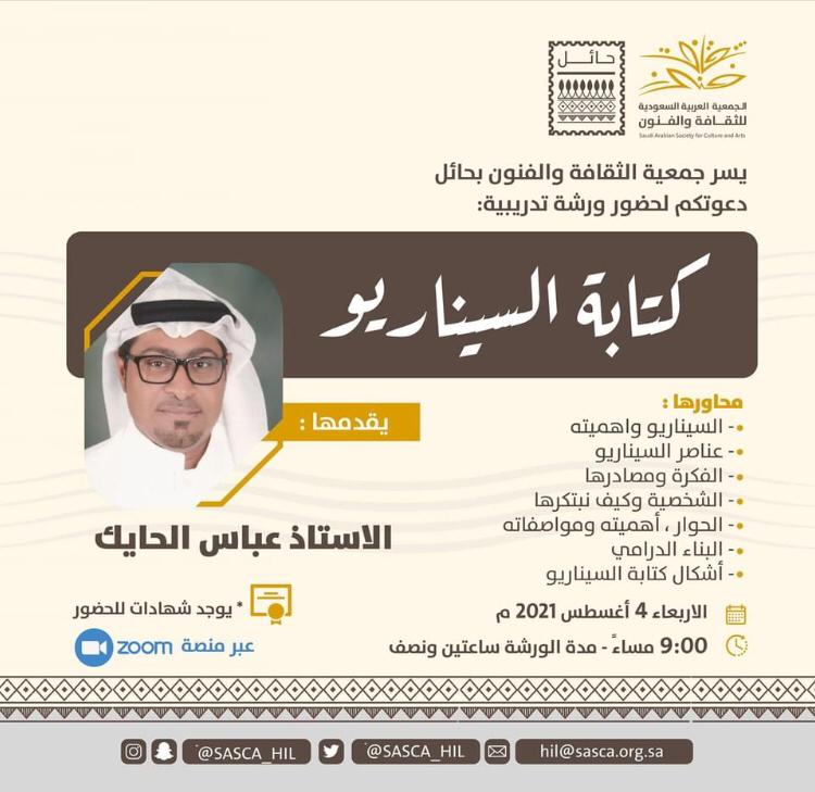 تنظم جمعية الثقافة والفنون بحائل دورة تدريبية عن بعد حول ”كتابة السيناريو“ يقدمها الكاتب عباس الحايك عبر تطبيق زووم اليوم الأربعاء.