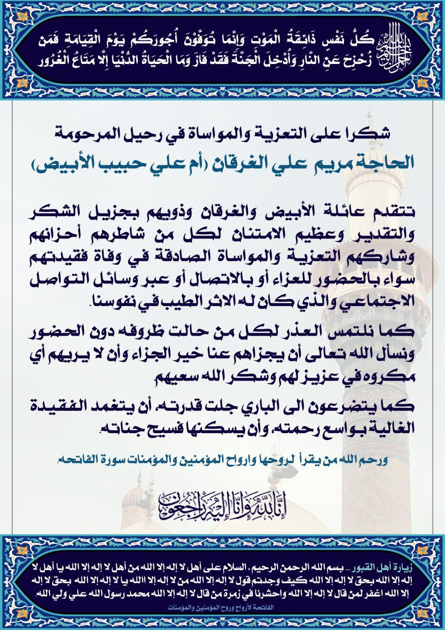 انتقلت إلى رحمة الله تعالى الحاجة مريم علي محمد عبدالله الغرقان «أم علي»، من أهالي تاروت «حي الشمال - المناخ».