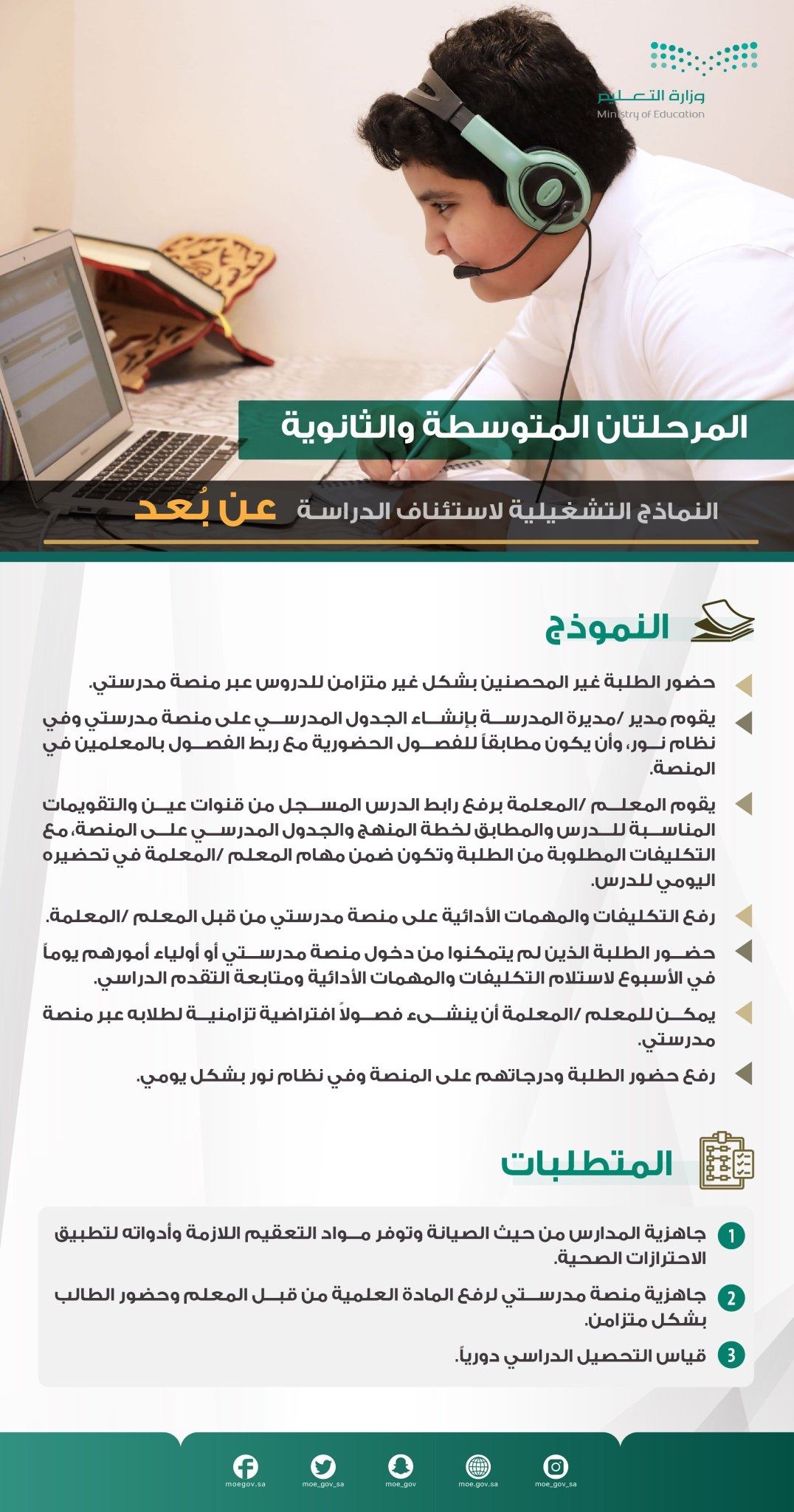 ثانياً: تكون الدراسة حضورياً وفق النماذج التشغيلية خلال الفترة الصباحية للطلاب والطالبات في المرحلتين المتوسطة والثانوية «من الفئات العمرية 12 عاماً فأكثر» مع اشتراط الحصول على جرعتين من اللقاح، وتكون الدراسة عن بُعد للطلاب والطالبات الذين لم يتلقوا جرعتين من اللقاح، ومن لم يتمكن من التحصين بجرعتين سيتم اعتباره متغيّباً حتى استكمال التحصين بجرعتين.