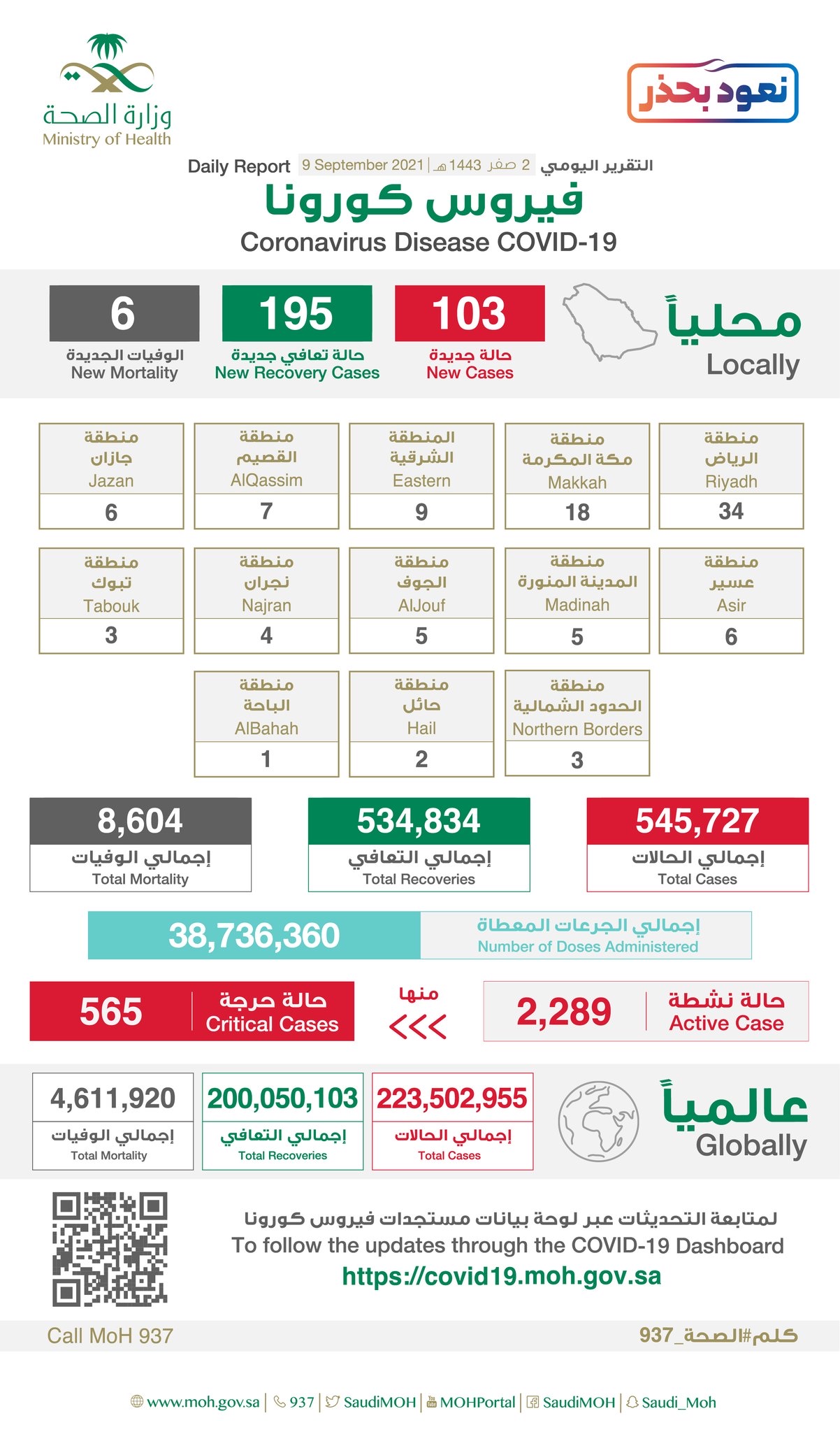 وبينت الإحصائية أن إجمالي عدد الإصابات في المملكة بلغ ”545727“ حالة.