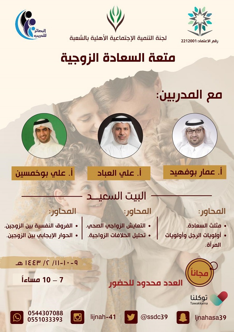 تعلن لجنة التنمية الاجتماعية بالشعبة عن فتح التسجيل في برنامج البيت السعيد حيث تنظم يوم الخميس محاضرة اجتماعية بعنوان «متعة السعادة الزوجية».