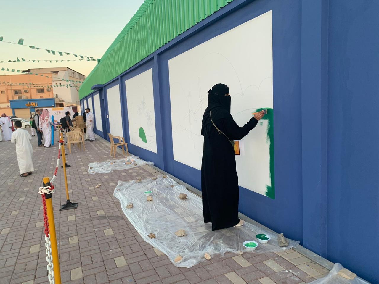 وشارك في رسم هذه اللوحة الجدارية عدد من الفنانين التشكيليين المعروفين بقيادة فريق «لنا إبداع»، ويؤدي دوره بشكل رائع، وتخلل هذه الفعالية بعض الأركان المتوافقة مع اليوم الوطني عبارة عن صور، كما وجه شكره لجميع من ساهم بالمشاركة في هذه الفعالية.