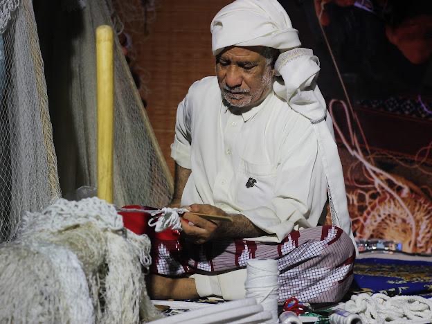 ”حسين بن علي“، قضى 50 عاما في صناعة شبكات الصيد من خلال العديد من الألياف التي يتم نسجها على هيئة شبكة، وتطورت صناعة هذه الألياف عبر الأزمنة، فكانت قديمًا تُصنَّع من الأعشاب والكتان ومن أشهرها ”الدنادين“ للغطس و”القراقير“ للصيد، ويقضي العم حسين ساعات طويلة في فعالية ”تحيا السعودية“ ليصنع شبكة الصيد ”ديين“ و”السالية“.