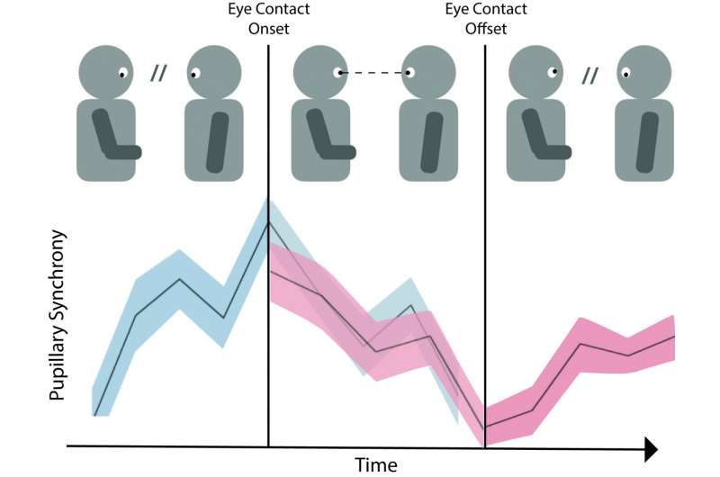 رسم رسم كاريكاتوري يوضح كيف تتزامن حالة واحدة من حالات الاتصال بالعين مع تزامن اتساع حدقة العين. قبل التواصل بالعين، يزيد تزامن الاتساع الحدقي حتى يصل إلى ذروته عند بداية الاتصال العين. بمواصلة الاتصال بالعين، ينخفض التزامن حتى يبلغ الحد الأدنى منه حين ينقطع الاتصال بالعين. المصدر: صوفي وولتجن.