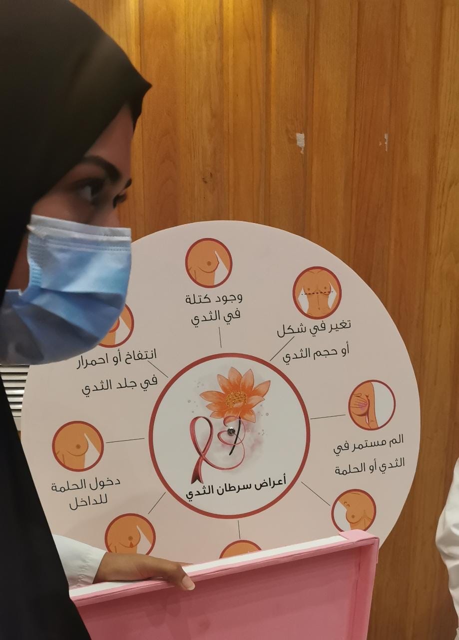 وألقت الدكتورة سلمى أبو قرين، استشارية ومدربة في أكاديمية طب الأسرة، ومديرة برنامج الكشف المبكر عن السرطان بقطاع القطيف، محاضرة، تعرضت فيها لتعريف سرطان الثدي، وإحصائيات عالمية ومحلية لانتشاره، وطريقة الفحص الذاتي، والتوقيت المثالي للفحص، مسلطةً الضوء على التغيرات المصاحبة للسرطان في مراحله الأولى.