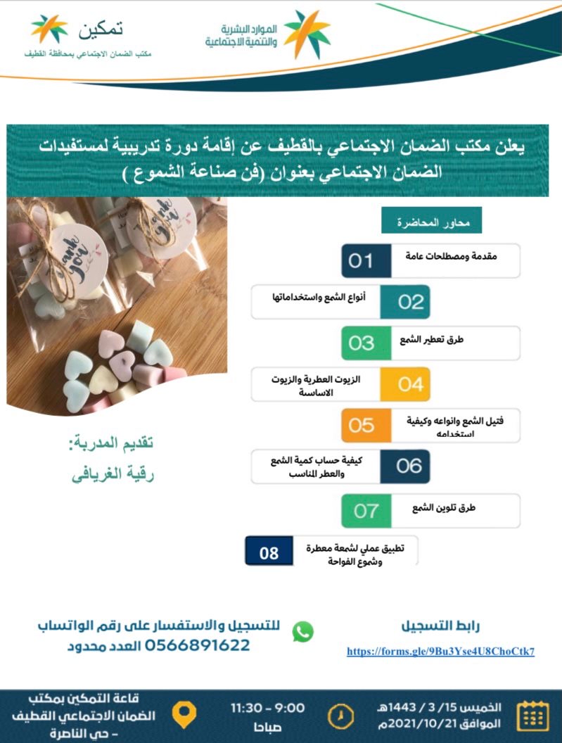دعت إدارة مكتب الضمان الاجتماعي بمحافظة القطيف، المستفيدات من الضمان، بالمبادرة والتسجيل لحضور الدورة التدريبية بعنوان ”فن صناعة الشموع“، بتقديم المدربة رقية الغريافي، المقرر تنفيذها صباح الخميس المقبل، من الساعة 9 حتى 11:30 صباحًا.