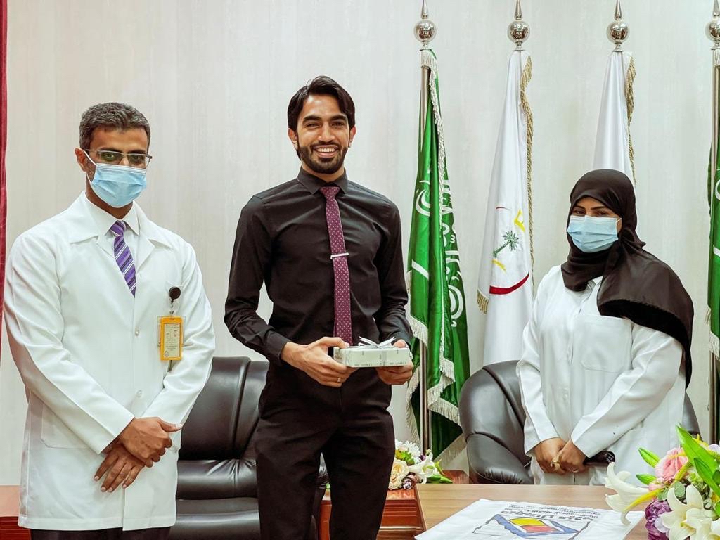 وكذلك تم تكريم د. محمد الناصر، رئيس الأطباء المقيمين، وذلك تقديرا لجهوده في تنسيق مناوبات الأطباء المقيمين، وتنظيم الأمور المرتبطة بهم، ومساعدتهم في حل ما يواجهون من مصاعب.