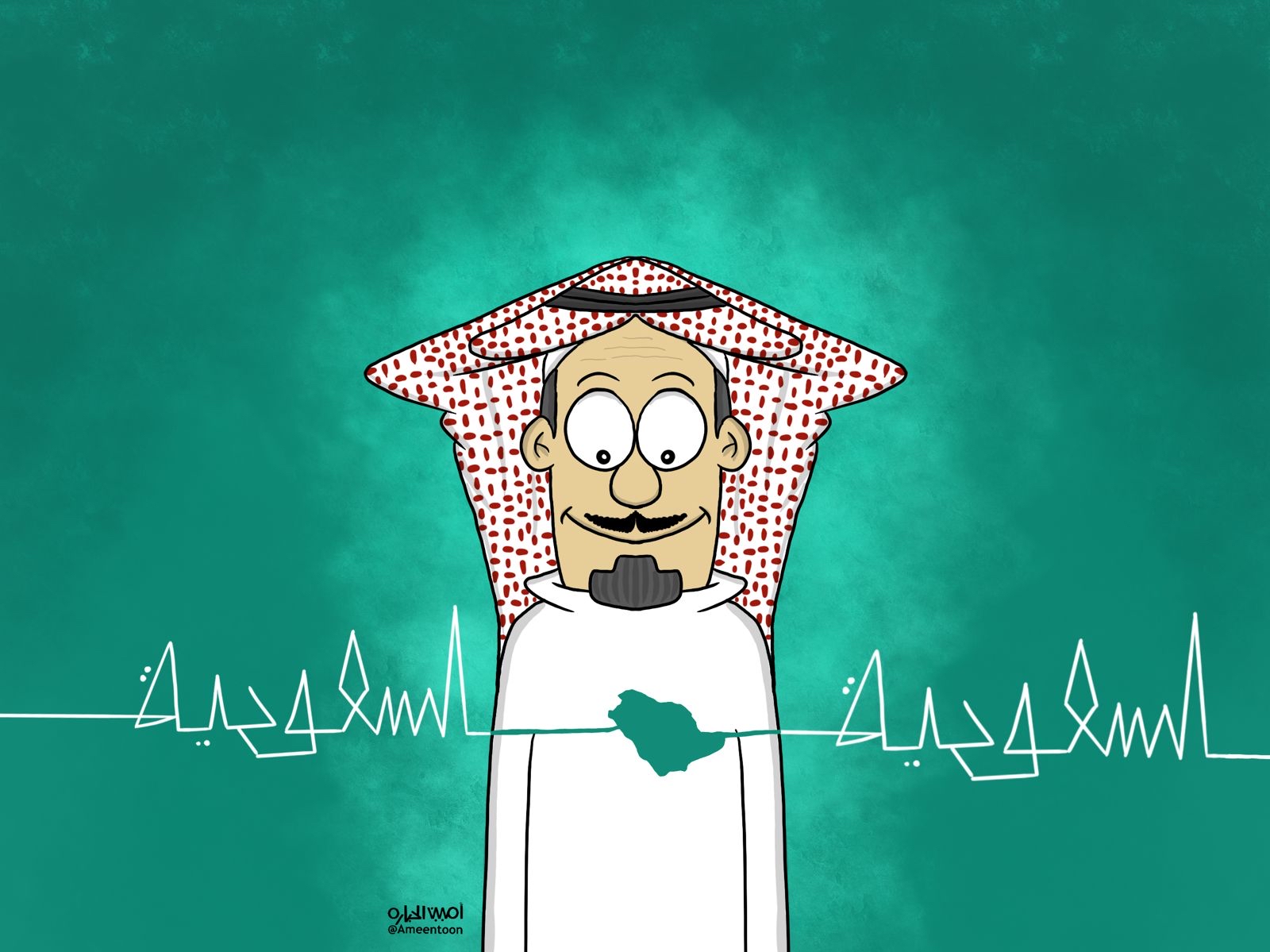 وتصور اللوحة الفائزة للزميل الحباره ”أن الوطن يعيش في قلب مواطن سعودي وأن تخطيط النبض لكل مواطن ينبض بحب“ السعودية"".