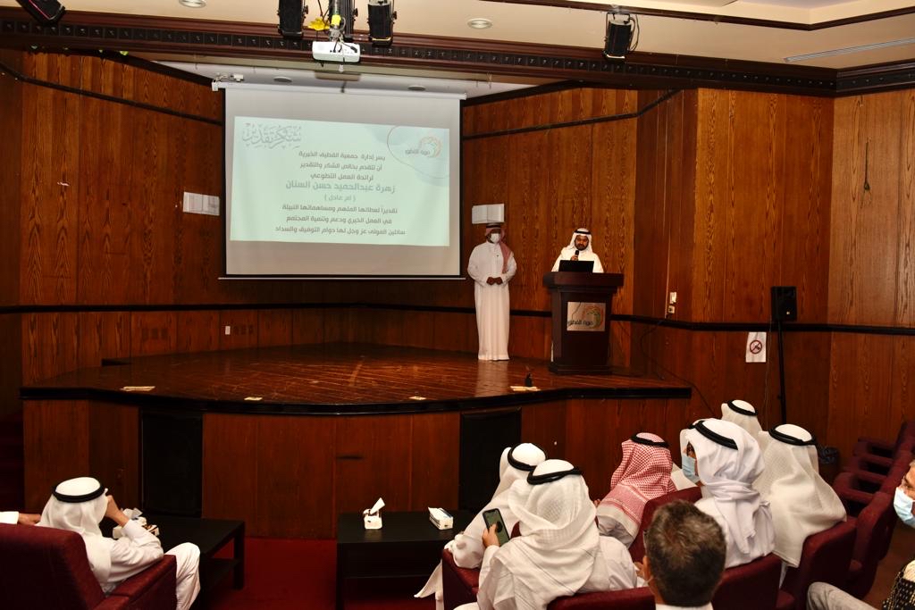 وأضاف: ”العزيزة زهرة السنان أم عادل أنت لنا بمثابة القدوة في العطاء وهذا التكريم بمثابة شكر وعرفان لما تبذلينه من وقتك وجهدك في العمل الخيري للجمعية وللمجتمع فجزاك الله خير الجزاء وأمدك بالقوة والصحة والعافية“.