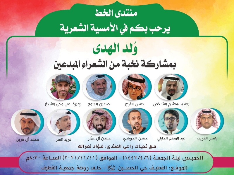 ينظم منتدى الخط الثقافي أمسية شعرية نبوية بعنوان ”وُلد الهدى“ في مقر المنتدى غدا الخميس.