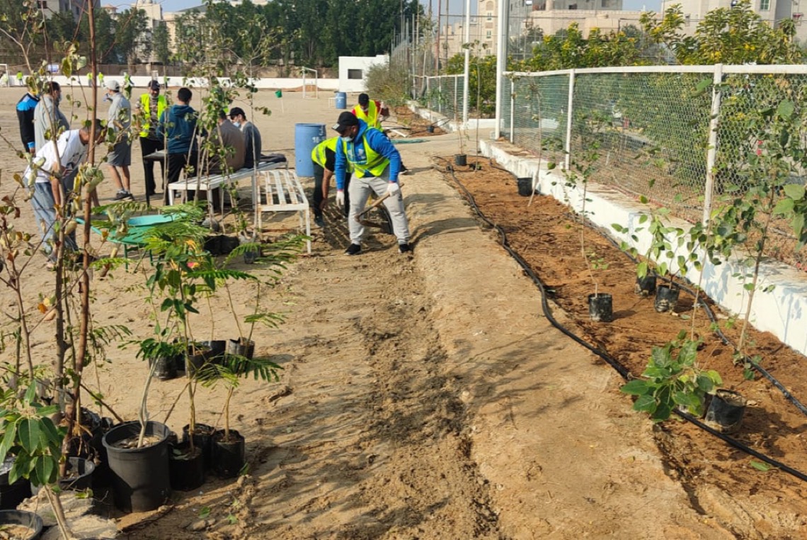 وقام المتطوعين بحفر وتجهيز الأحواض الزراعية على امتداد جوانب الملعب واضافة التربة الزراعية والأسمدة، حيث سيصل مجموع الأشجار المزروعة إلى حوالي 250 شجرة وأكثر من 5000 زهرة.