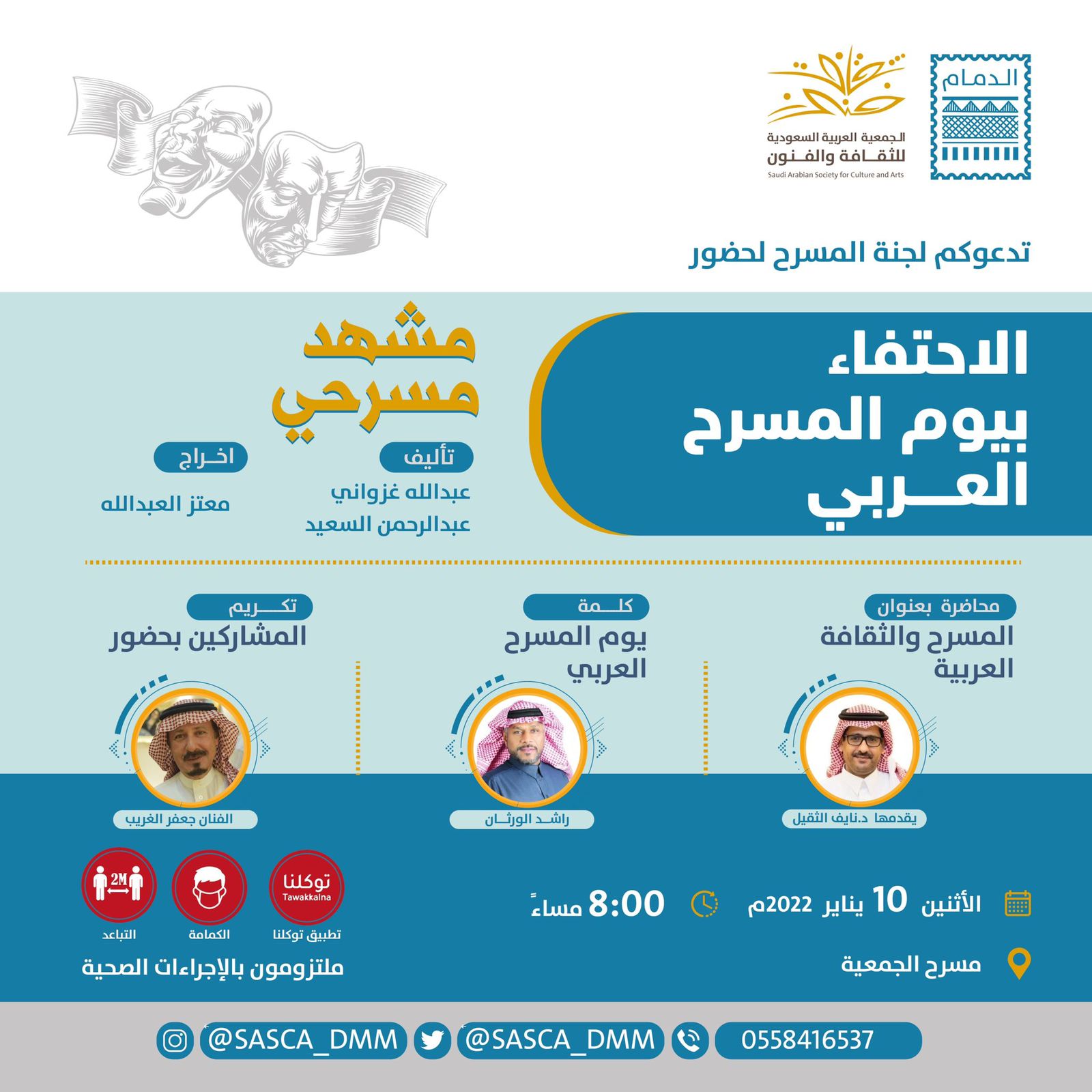 تنظم لجنة المسرح التابعة لجمعية الثقافة والفنون بالدمام احتفالاً بيوم المسرح العربي.